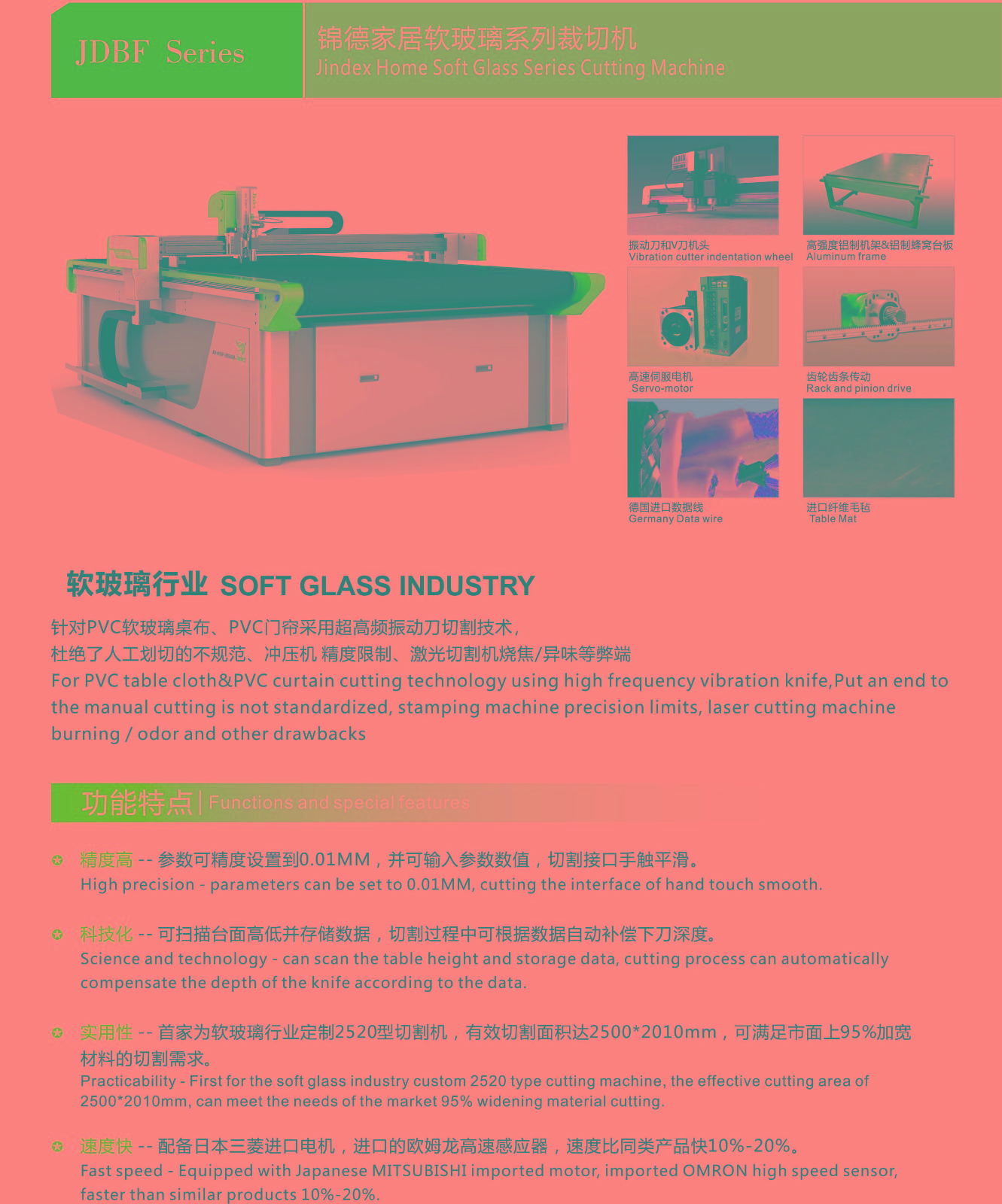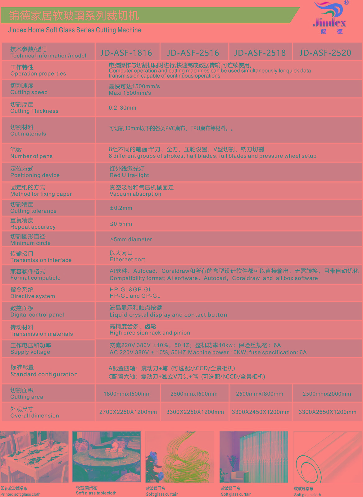 錦德振動(dòng)刀自動(dòng)裁剪機(jī),裁剪效率高,相比人工快5倍左右,相比激光快2倍左右;裁剪精度高,誤差小于0.02mm;高度鎢鋼刀片切割,可以裁剪任意異形材料;智能排版系統(tǒng),節(jié)省材料10%以上;環(huán)保無(wú)污染,響應(yīng)國(guó)家綠色生產(chǎn)的號(hào)召。 玻璃=pvc軟質(zhì)水晶板在工業(yè)、家庭使用的都很廣泛,pvc軟玻璃的特點(diǎn):耐熱、耐寒、耐光照、抗靜電、抗老化、耐重壓、耐強(qiáng)酸堿、透光性好、使用壽命長(zhǎng)、不變形、不發(fā)碎、不發(fā)硬、高彈性、無(wú)毒無(wú)味等等!